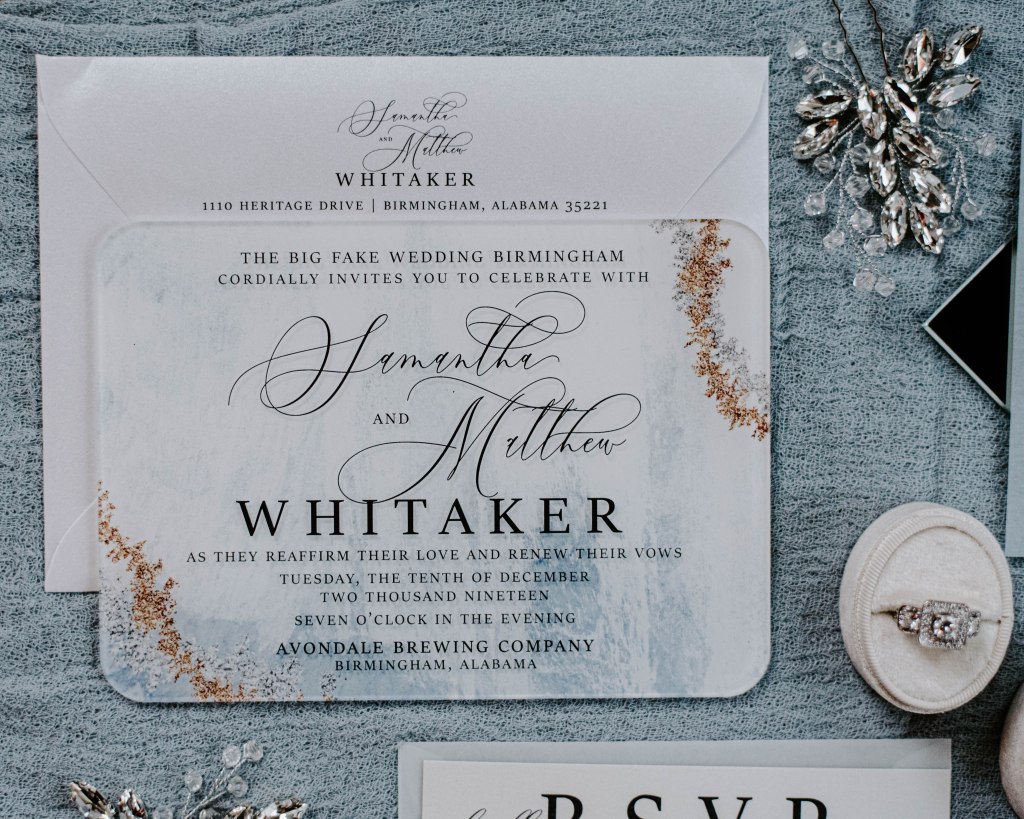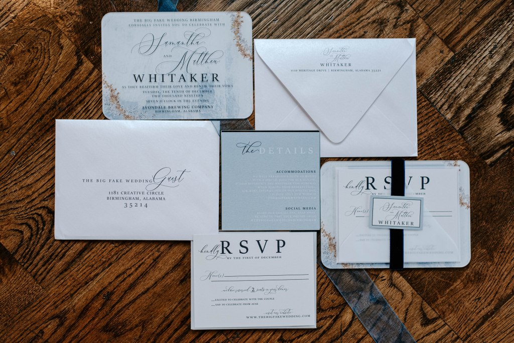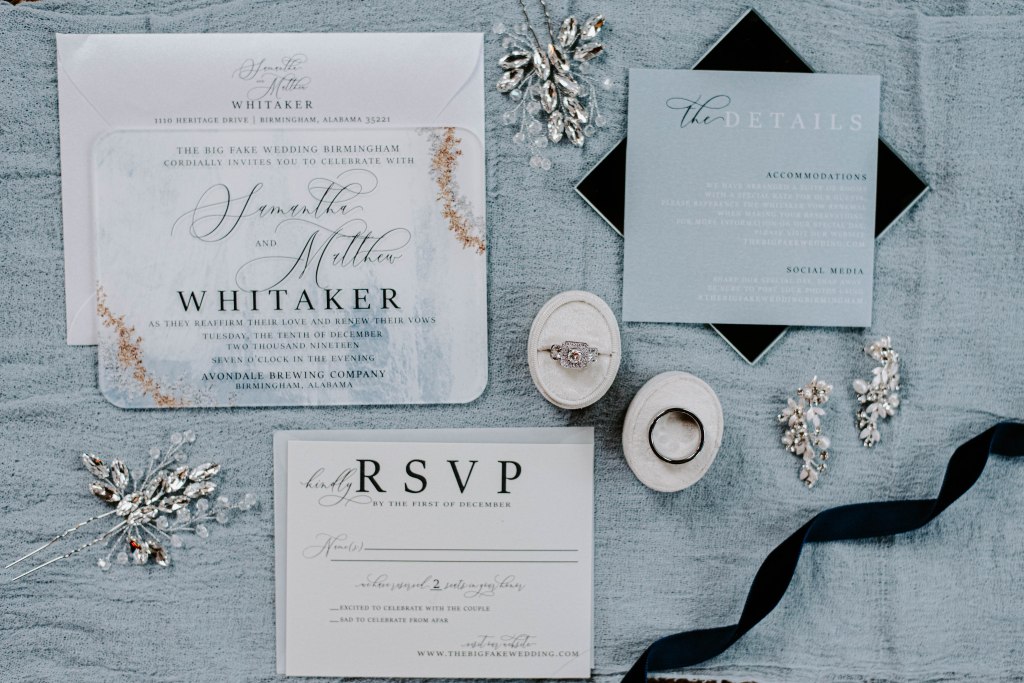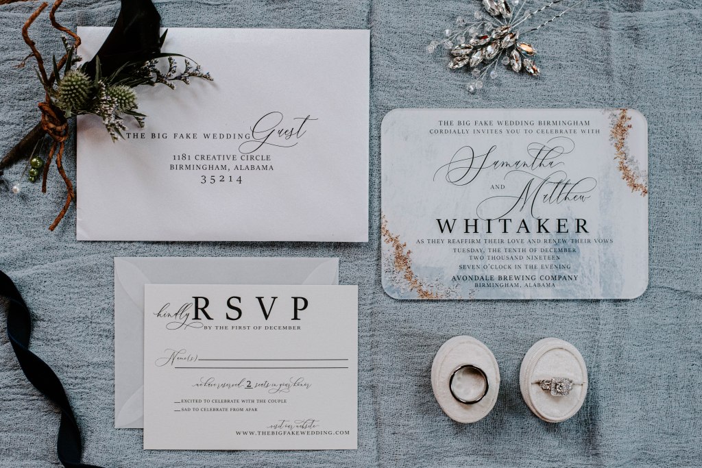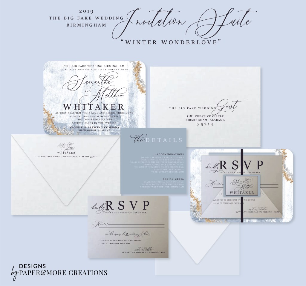 We’re so excited for the opportunity to share our first experience showcasing as the Invitation Designer for The Big Fake Wedding Birmingham. What’s The Big Fake Wedding, you ask? It’s a bridal show alternative, in the form of a big, fake wedding. A chance for guests to experience a team of collaborating wedding professionals in action…getting a feel for the beautiful event designs and decor, awesome entertainment, great food and cocktails, and even more. From the inspo board, to the final design, we’re revealing how our design came together, and complimented this stunning and elegant Iceland-inspired wedding event.